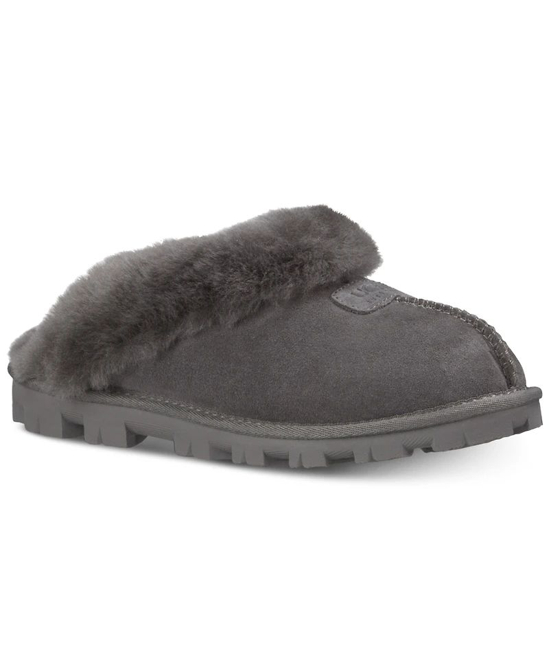 A plush sheepskin collar and effortless slip-on design pair with a rugged sole for ultimate cozy versatility in Ugg's Coquette slippers.