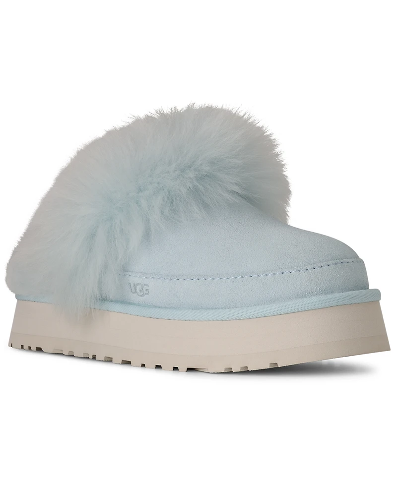 Step into comfortable style with these Disquette platform shoes from Ugg, showcasing a round toe and slip-on design. A generous sheepskin insole provides plush support with every step. The sleek silhouette offers a versatile look for various occasions.