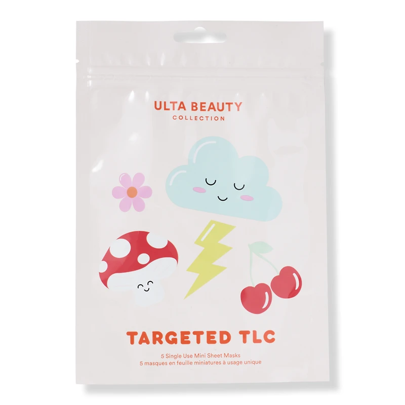 TARGETED TLC MINI SHEET MASKS 5CT 5CT. Benefits: Hyaluronic acid delivers nourishing benefits to skin in just 15 minutes. Infused with cucumber extract and aloe to soothe and condition. Unique shapes designed to help target key focus areas of your face: soothe tired under eyes, replenish dry cheeks, or nourish your t-zone.. 5 adorable, single-use mini sheet masks. Fragrance free formula is gentle on skin. Dermatologist Tested. Features: Proudly cruelty free with clean ingredients. Resealable sachet packaging keeps masks fresh. Formulated without parabens, sulfates, and phthalates. Key Ingredients: Hyaluronic Acid: helps skin appear more supple. Cucumber Extract & Aloe: helps to soothe the skin. Allantoin: keeps skin feeling fresh & super soothed.