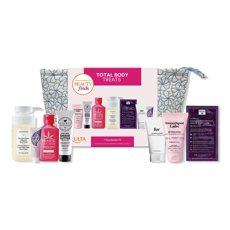 TOTAL BODY TREATS. Includes: Dionis Goat Milk Skincare, Dionis Goat Milk Shave Butter (1.0 oz). Earth Therapeutics, Collagen Hydrogel Under-Eye Patch (1 Pair). Fur, Kp Body Scrub (1.0 oz). Hempz, Mini Brazilian Berry Body Moisturizer (2.25 oz). Lanolips, Face Base Vitamin E Day Cream (0.17 oz). Naturium, The Glow Getter Multi-Oil Body Wash (3.4 oz). Sweetspot Labs, Fragrance-Free Ph-Balancing Intimate & Body Cleanser (1.0 oz). : :