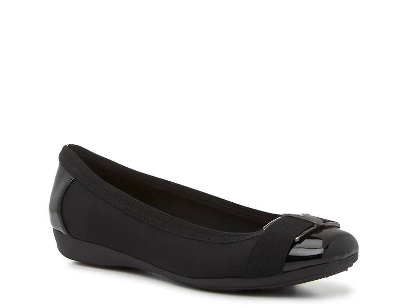 Go for simple sophistication with the Ultimate flat from Anne Klein. This timeless style is crafted with a glossy square cap toe and back heel covering. Complete with a solid wedge heel and a cushioned iflex footbed that supports your steps.