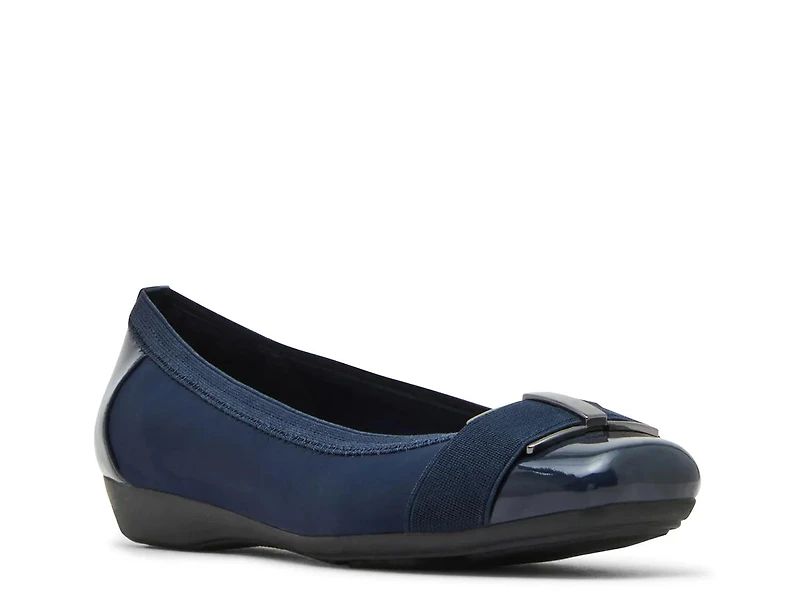 Go for simple sophistication with the Ultimate flat from Anne Klein. This timeless style is crafted with a glossy square cap toe and back heel covering. Complete with a solid wedge heel and a cushioned iflex footbed that supports your steps.