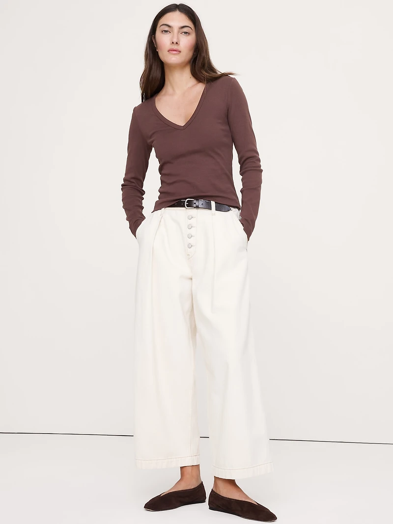 Luxurious and softly structured, this 100% cotton long-sleeve tee is the perfect weight for all seasons. Plus, we added a seam at the center-back to better define the waist. Stretches to fit. V-neck. Straight hem. Stretches to fit. Long sleeves. Above-hip length. Model wears size XS.