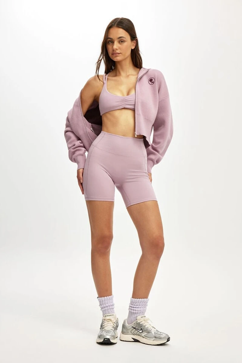 Everyone's favourite bike short. Made from smooth stretch polyester with a sleek feel, these fitted shorts have a high-rise waistband for core support, side pockets for your essentials, and moisture-wicking fabric that keeps you cool. Pair with a matching crop from the active range to complete the look. Style it for the studio, the street, or anywhere in between.