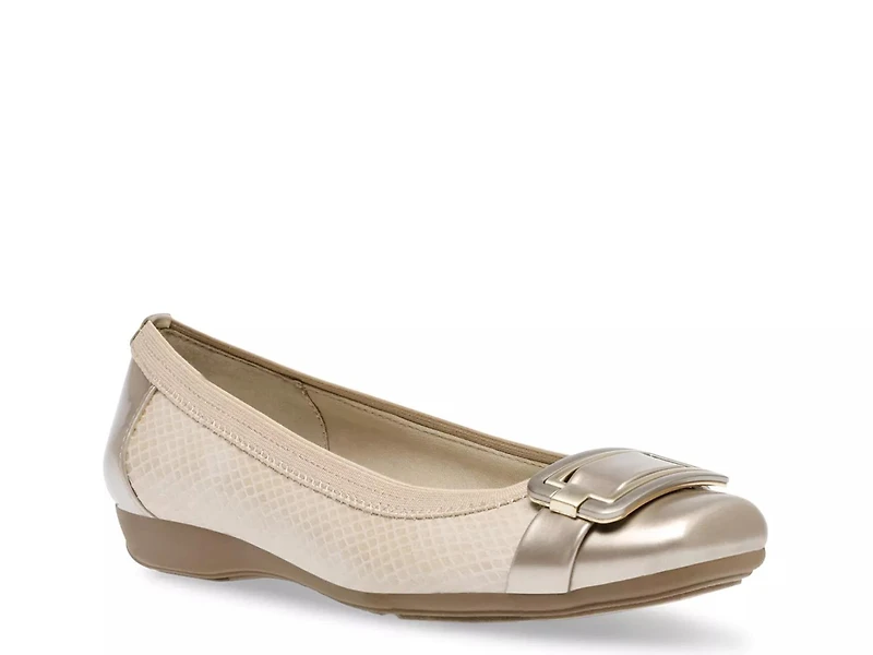 Look cute in every season with the weather-ready Unice flat from Anne Klein. A glossy square toe and heel counter are complemented by an oversized buckle detail, 3mm memory foam cushioning and a bendy iFlex style in this comfy slip-on.