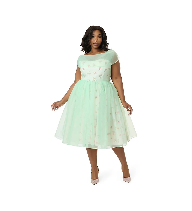 This life-size reproduction of Modern Art swing dress, originally released in 1965, features a delicate chiffon layer over a charming rose pattern that brings a touch of romance to your wardrobe. The playful off-the-shoulder neckline with the roll collar adds just the right amount of flirtation!