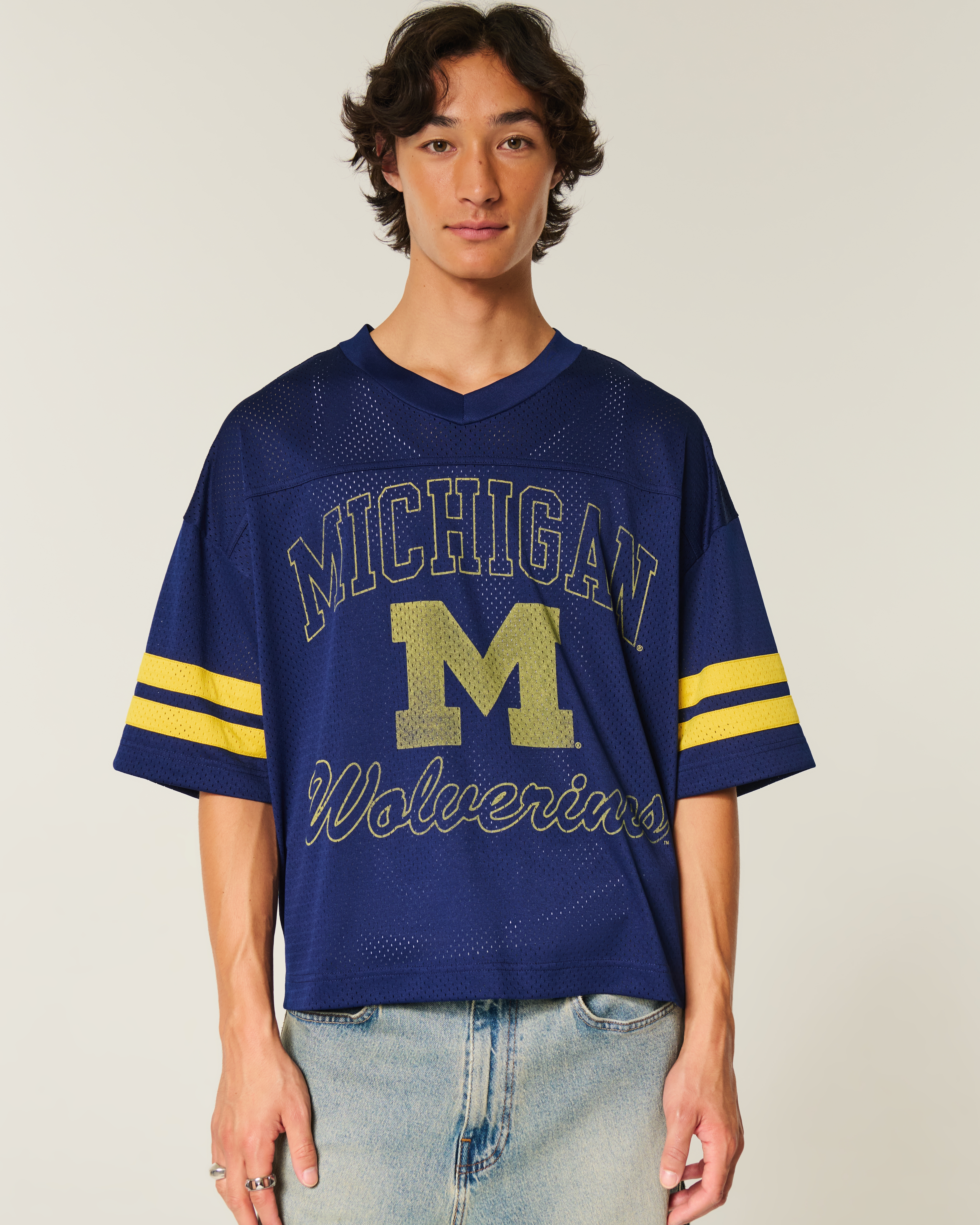 This classic football jersey is made with soft mesh fabric and features official licensed University of Michigan print graphics. V-neckline, short sleeves. Baggy Crop Fit. Imported.