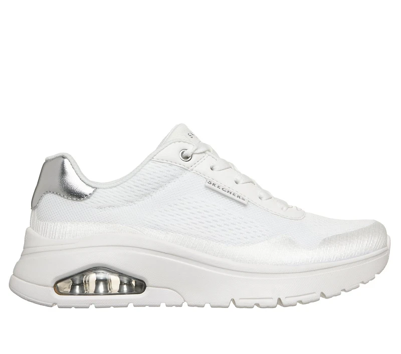 Elevate each step with air-cushioned comfort in Skechers Street™: UNO Flex - Elevatin'. This fashion style features a mesh, satin Lycra, and hotmelt overlay upper with a lace-up front, a cushioned Skechers Memory Foam™ insole, and a visible Skech-Air® airbag midsole.