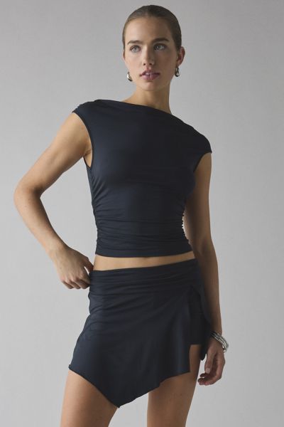 UO 2-piece set designed in a soft & stretchy cupro fabric. Features a ruched, boatneck crop top and low-rise mini skort with an asymmetrical hanky hem. Find it only at Urban Outfitters.