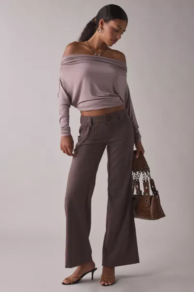 Tailored twill UO trousers designed in a wide leg silhouette. Workwear-inspired pants featuring a low-rise waistline, front patch pockets and a utility strap detail for a Y2K vibe. Try them styled with graphic tees, blouses and knits to switch up your look! Find them only at Urban Outfitters.
