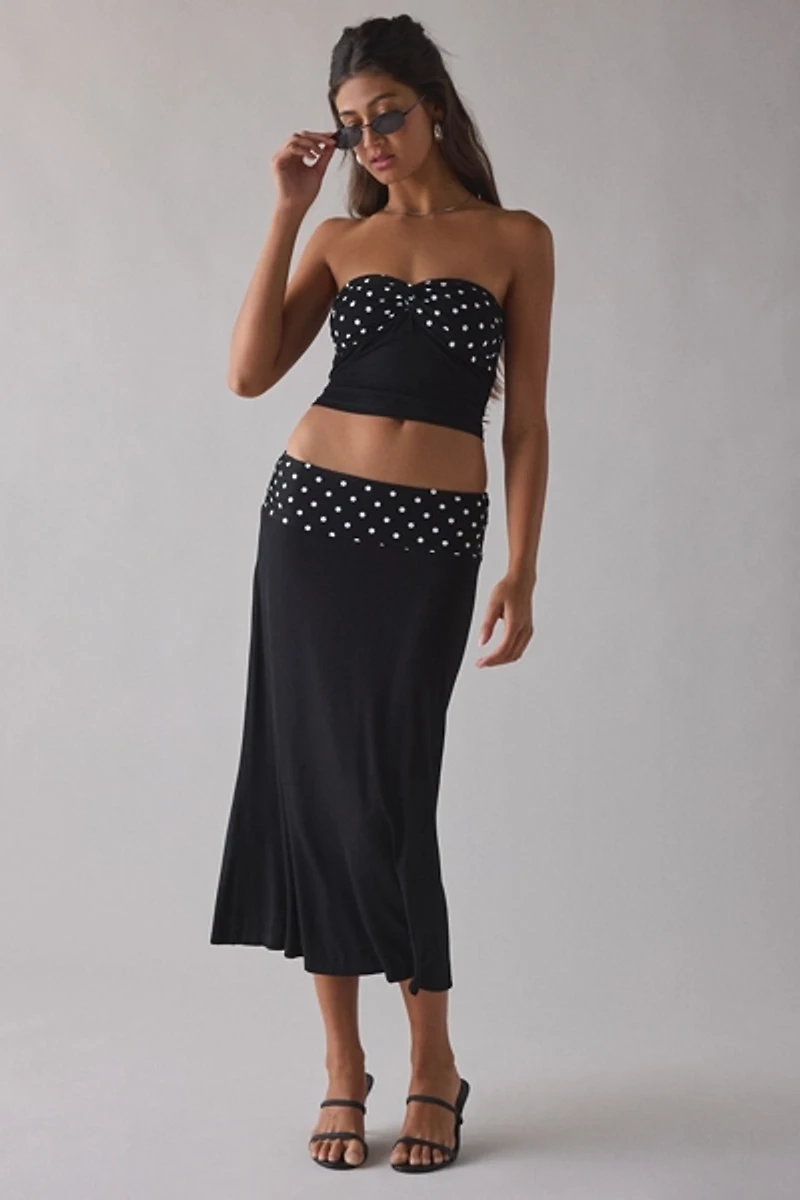 Get spotted in this UO 2-piece set including a co-ord top and skirt. Matching set designed in soft & stretchy jersey knit with a strapless tube top and a low-rise midi skirt topped with polka dots for a femme finish. Perfect styled together & mixed with your other UO favorites for endless ways to wear! Exclusively at Urban Outfitters.