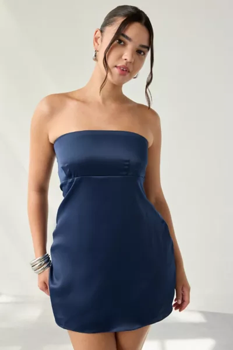 Elevated UO mini dress designed in a shiny, soft-touch satin with a touch of stretch. Slip dress featuring a strapless neckline, tailored bust and an empire waistline. Topped with an open-back cutout with a tie-back bow for a femme finish. Only at Urban Outfitters.