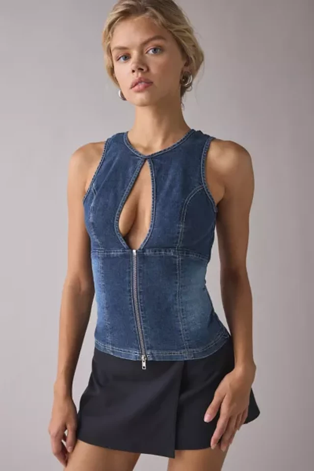 UO Nicola Plunging Keyhole Cutout Zip-Front Denim Vest Top