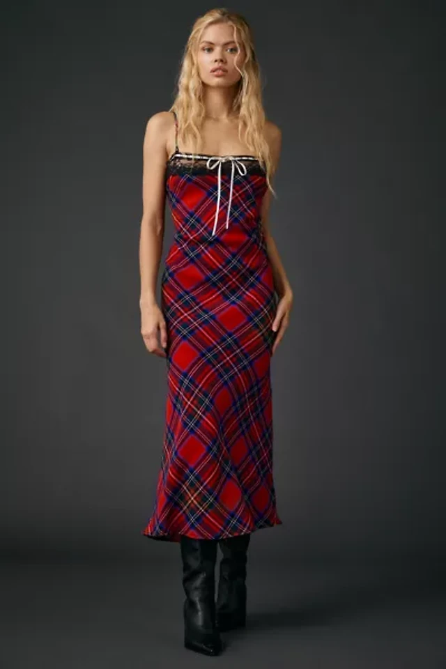 UO Plaid For You Lace Trim Slip Midi Dress