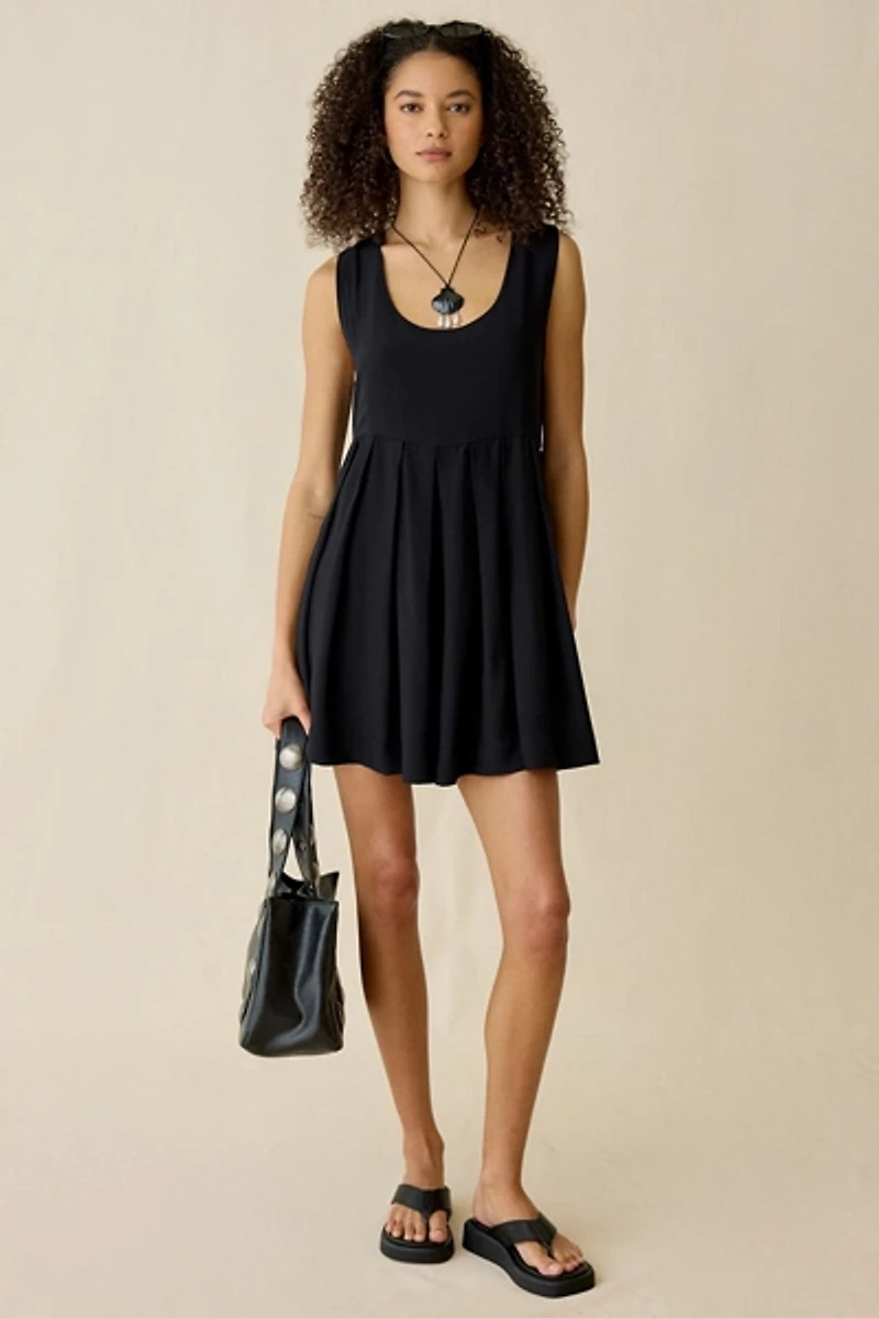 Playfully pleated UO mini dress designed in a floaty, babydoll silhouette. Short swing dress in a lightweight woven fabric featuring a scoop neckline, sleeveless design, empire waistline and full, twirl-worthy pleated skirt. Finished with our favorite dress detail- pockets! Perfect on its own and layered with bralettes, tees and swimwear for endless warm weather outfit ideas. Only at Urban Outfitters.
