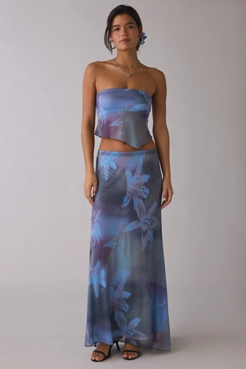 UO 2-piece set designed in soft, stretch floral print mesh. Matching set featuring a cropped tube top with a slanted asymmetric hem and low-rise maxi skit in a body-skimming silhouette. Perfect styled together or mixed with your other UO favorites for a cute party outfit or going out look! Exclusively at Urban Outfitters.