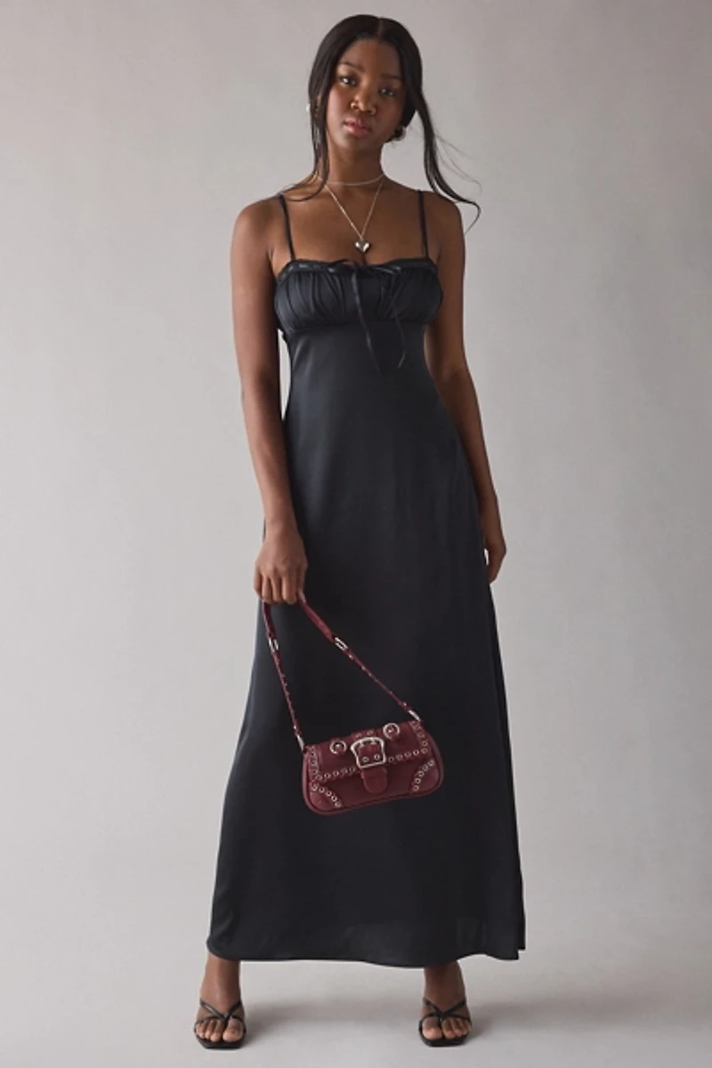 UO Tied With A Bow Lace + Ribbon Trim Satin Slip Maxi Dress