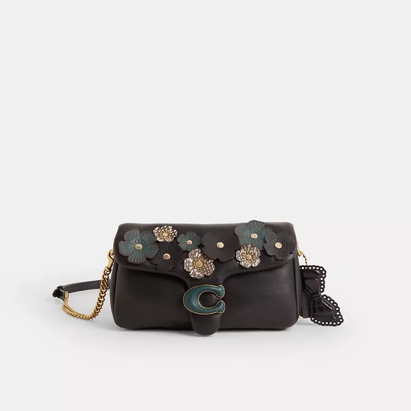 Pre-owned and now (re)loved, this Pillow Tabby Shoulder Bag 26 is a very special Coach upcrafted design inspired by our commitment to rethinking and reducing our impact on the planet. Saved from the landfill, this gently-worn bag was lovingly repaired and transformed by our in-house craftspeople who added clever details to give it a second life. It’s completely one-of-a-kind, and comes with its own unique set of charms. Wear it, love it, pass it on.Reimagined with a smattering of our dimensional Tea Rose appliqué by Rose Oliva featuring luxe snakeskin, sophisticated hues and a pop of color, this flap-front style has been expertly cleaned, conditioned and restored. Our talented craftsperson Ella Mulley embellished the flap with die-cut leather and genuine snakeskin blooms, re-covered our Signature hardware in a matching hue, repaired bottom threads, spot-painted corners, then added a long leather/chain strap and a playful repurposed charm. The Pillow Tabby reimagines the structured silhouette of an archival 1970s Coach design with plush, ultra-soft leather and our Signature hardware. The compact 26 features two detachable straps to carry by hand, style as a short shoulder bag or wear crossbody.