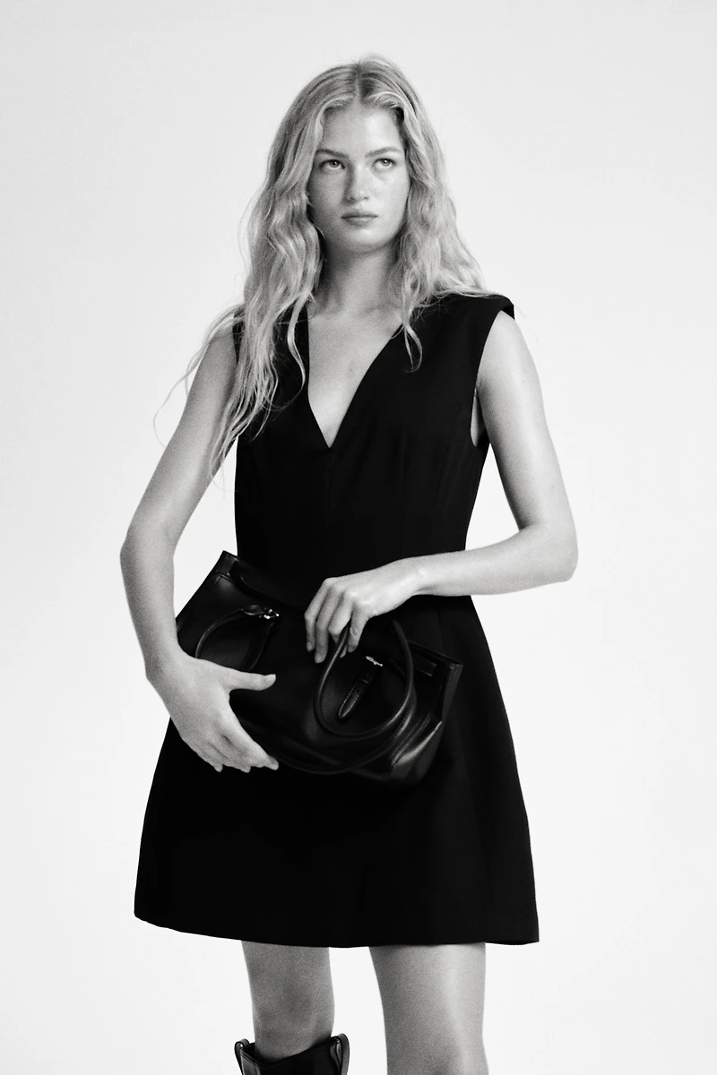 Short, sleeveless dress in twill with a fitted bodice and flared skirt. Low-cut V-neck at front, concealed zipper at back with hook-and-eye fastener, and shoulder pads. Lined.