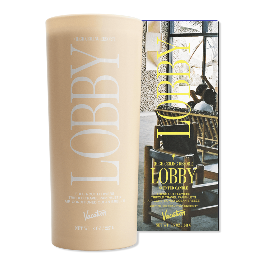 VACATION CANDLE LOBBY 8OZ WHITE. Features: Luxury soy-blend wax. Hand poured in the USA. 100% cotton wick. 85hr burn time. Generously tall glassware. Fragrance Family: Fresh cut flowers, high gloss magazines, air-conditioned ocean breeze. :