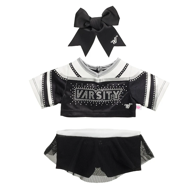 Dress your bear like a true cheerleading all-star in this fun Varsity Spirit cheer uniform! The sparkly All-Star uniform includes a black top with a matching black skirt and hair bow.