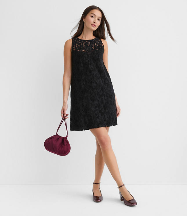 Finished with the sweetest velvet bow back - and a sheer front and back yoke - this lush velvet floral lace dress is all about the femme and flirty details. Crew neck Sleeveless Button back keyhole with velvet bow trim. Lined body, unlined front and back yoke., Imported:, Fit: Shift - fits straight and relaxed, Length: 33"from center back neck to hem, measured from a size 8 / M, Fabrication: Body 53% Polyester 47 Nylon, Lining: 100% Polyester, Garment Care: Machine Washable Loft Velvet Floral Lace Mini Dress Size 2 Black Women's by Loft Size Regular - 2 Black Women's Shift, Dresses Going Out Body: 53% Polyester 47% Nylon Lining: 100% Polyester Machine Washable