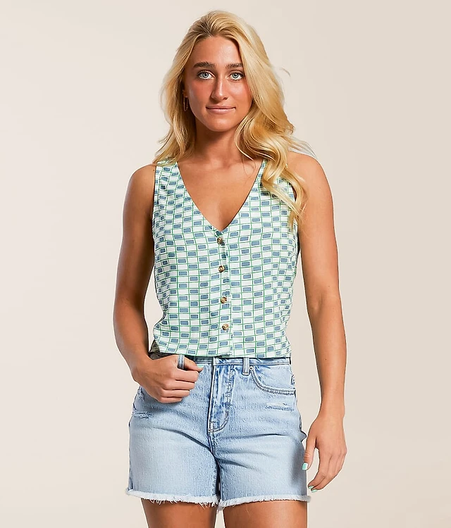 Printed button down cropped tank Bust measures 34" on size small Body length 18 1/2" on size small