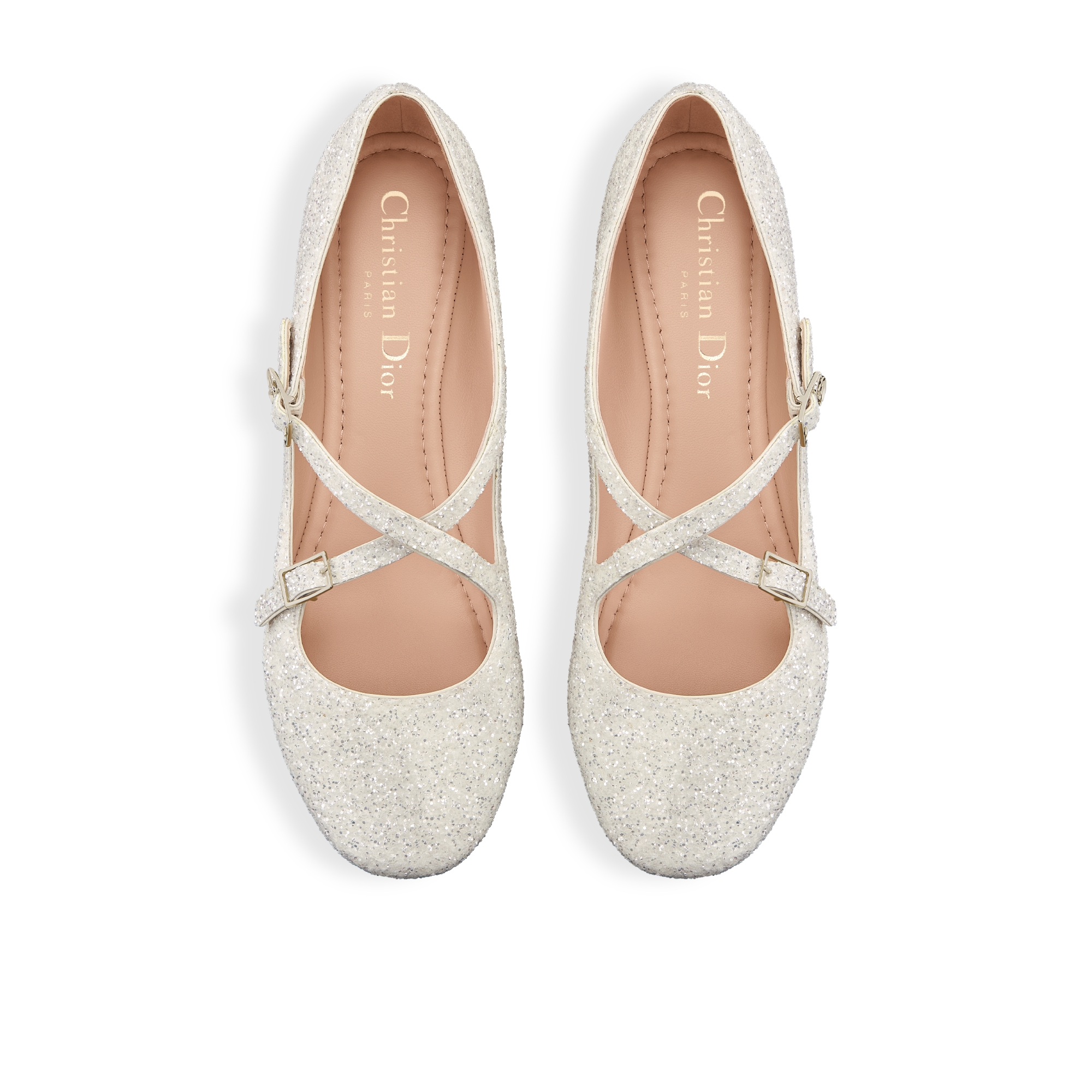 Revealed at the Cruise 2026 Fashion Show, the new Very Dior ballet flat is elegant and graceful. The lambskin upper is fully covered in white glitter. Its round-toe silhouette is distinguished by adjustable crisscrossed straps on the front, featuring an archive-inspired silver-finish metal interlaced CD signature. Equipped with a padded calfskin insole, the comfortable ballet flat will complete sophisticated looks. Main composition: technical fabric and lambskin. Lambskin lining. Crisscrossed straps with adjustable CD signature buckle. Padded cowhide and TPU insole. Leather sole with star, Christian Dior's lucky symbol. Made in Italy