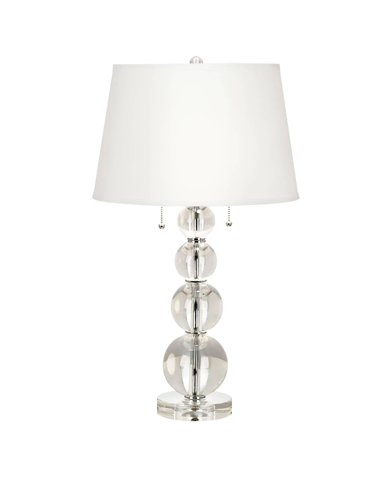 Stacked crystal globes provide an alluring effect to this appealing table lamp. The crystal disc at the bottom is topped with crystal spheres gradually decreasing in size. Twin chain pulls and a ball finial finish the look with sophistication. This lamp comes with a tabletop dimmer, which allows you to control the level of lighting. Simply insert the lamp plug into the dimmer outlet, and then slide the switch on the control to dim or brighten the lighting.