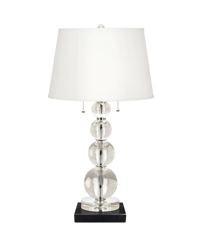 Stacked crystal globes provide an alluring profile on this modern lamp design from the Vienna Full Spectrum brand of lighting. The crystal glass spheres get smaller as they reach upwards, and at the very top of the design is a tapered drum lamp shade in a white fabric. Twin chain pulls and a ball finial finish add to the look of sophistication. The lamp also comes with a real black marble riser that can be used to give the design extra height and style.
