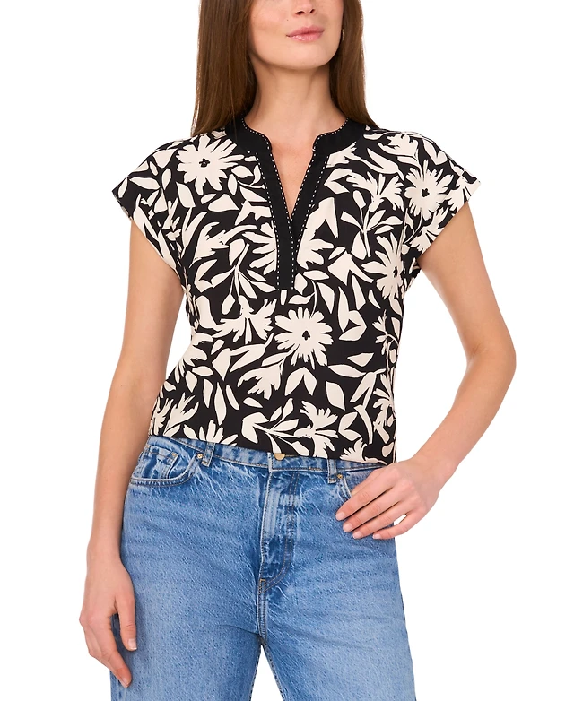 Vince Camuto Women's Floral-Print Split-Neck Cap-Sleeve Top