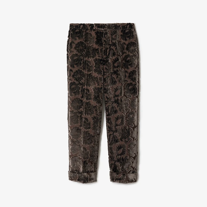 Trousers made in Italy from a cotton blend velvet, jacquard-woven with intertwining flora and fauna. The textural fabric is inspired by the richly furnished interiors of great country houses. Debuted on the Burberry Winter 2025 runway, the style is fully lined and tailored to a slim fit with turn-ups for a slightly cropped silhouette. Hook, button and zip closure Side slip pockets, back welt pockets