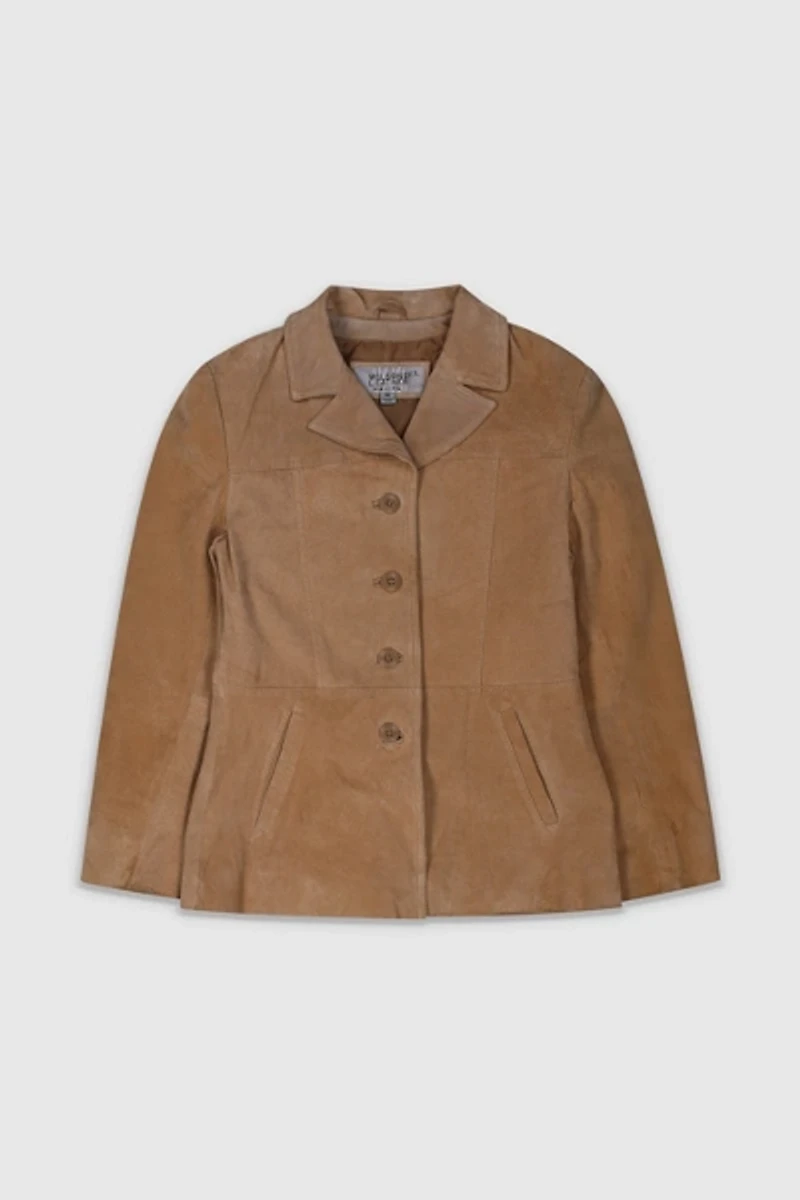 - - Vintage 90s Wilson Leather Suede Jacket. This gorgeous suede leather jacket is a gorgeous beige tan color with a classic tailored fit and timeless silhouette. This piece features a soft genuine suede exterior, structured notched collar, four-button front closure, and clean vertical seaming that gives it a flattering, slightly fitted shape. Made from 100% genuine leather and in great vintage condition 8/10 with some light wear as seen in photos. Tag reads vintage size M but please compare to measurements below for the best fit!