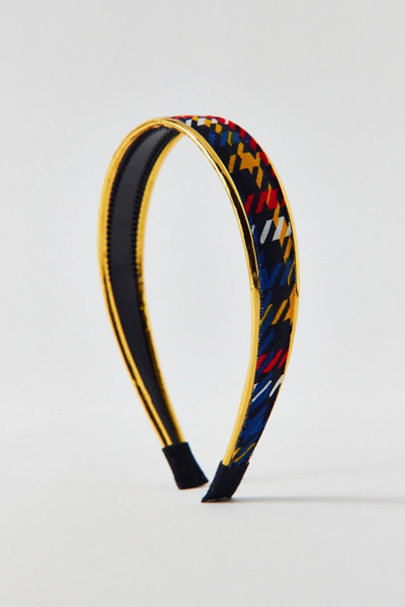 Vintage headband to top off your preppy looks! Plastic headband topped with plaid fabric and metallic trim that effortlessly holds back hair and adds a fun pop of plaid to your look.