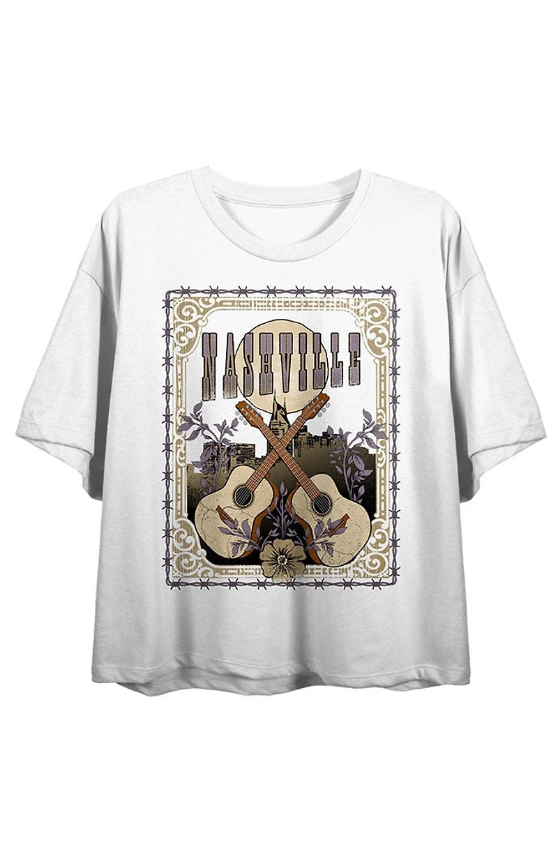 Hit the music scene with this Vintage Country Nashville crop t-shirt. The shirt features a pair of guitars under black letters that spell out, "Nashville," while a floral distress border surrounds the image. The tee comes in a white short-sleeved crop top. Country music fans will love this comfy crop tee.