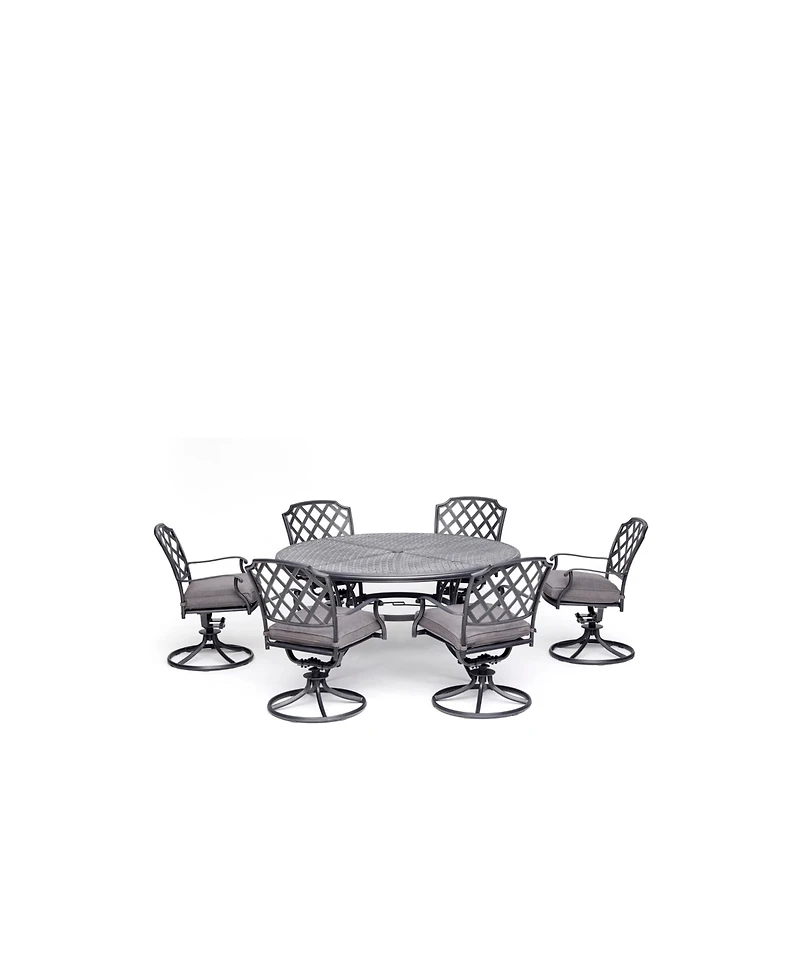 Take a modern approach to laidback outdoor entertaining with this appealing 7-piece set. The textured open-work design and handsome pewter finish of the six swivel chairs and round dining table beautifully refresh your patio or deck.