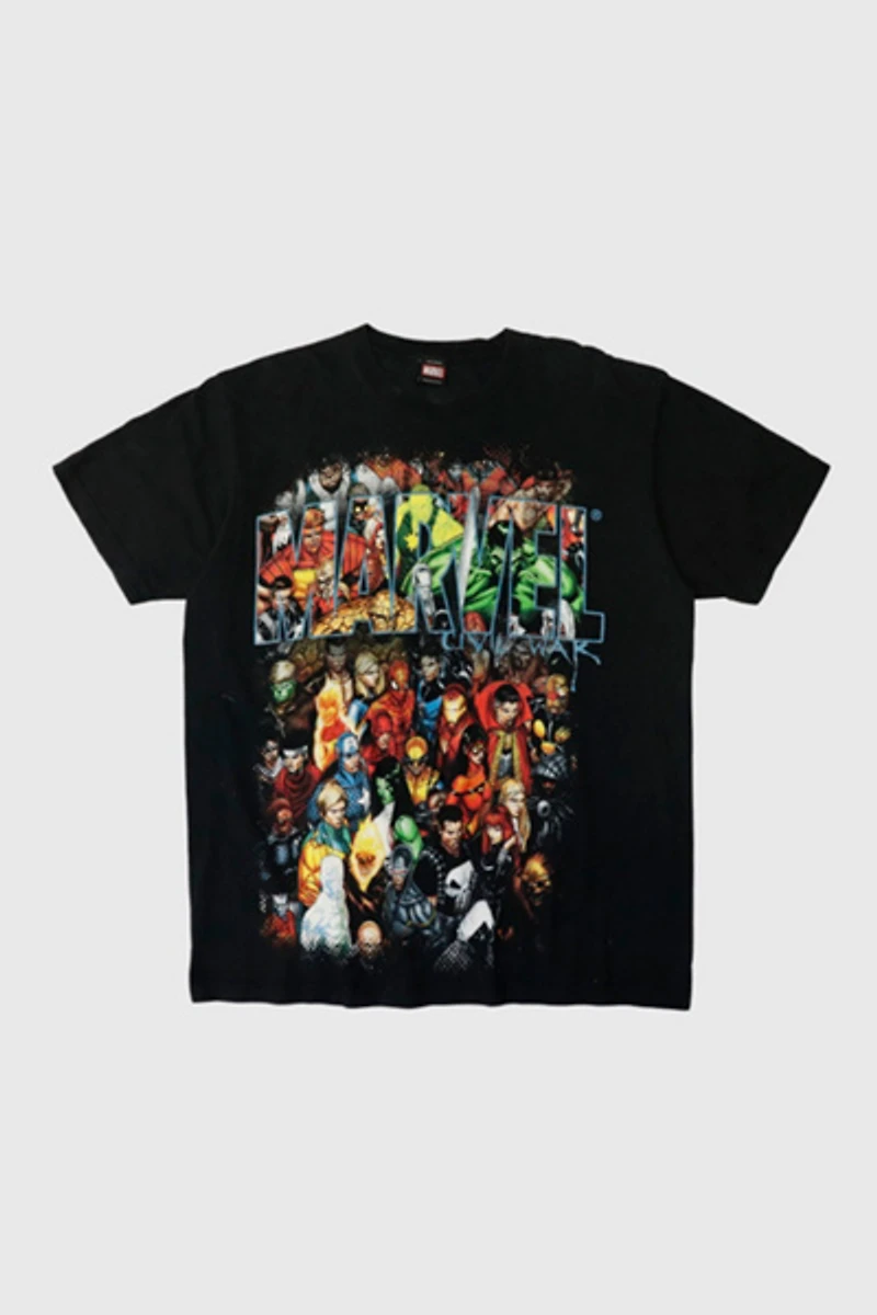 • - Graphic tee featuring vibrant comic book characters and large Marvel lettering. The shirt displays colorful hero illustrations on black fabric. General wear consistent with light use.