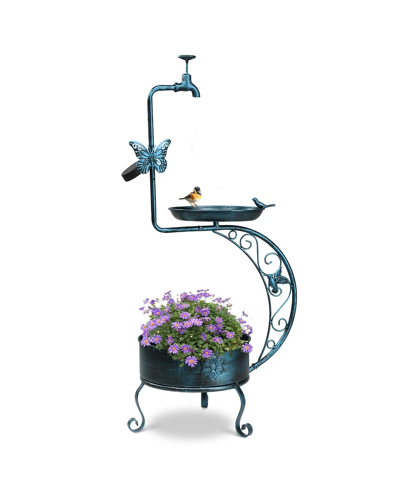 Enhance your garden s charm and attract feathered friends with this Vintage Metal Bird Bath. Featuring a timeless design, this multi functional piece serves as a bird bath, solar-powered lamp, and flower planter all in one. The metal construction ensures durability and stability, while the ornate details add a touch of elegance to your outdoor decor.