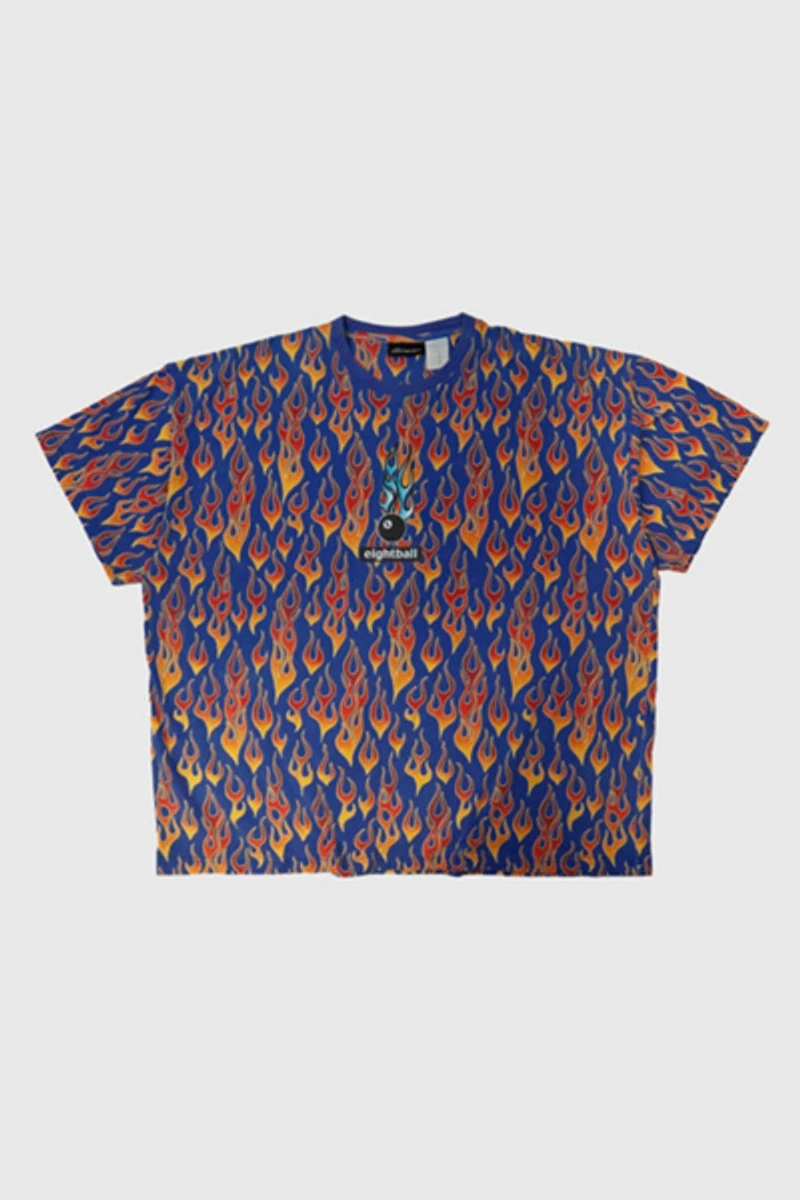 • - Bright flame pattern t-shirt with eightball graphic on the front. Some minor signs of wear visible. No major flaws. We do our best to show all flaws of any garment through the pictures. Please check pictures for condition.