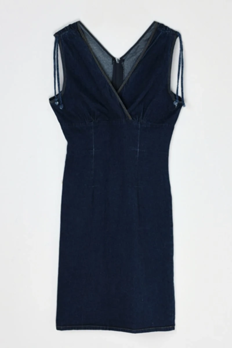 Vintage Y2k Dark Wash Denim Midi Dress with Shoulder Ties