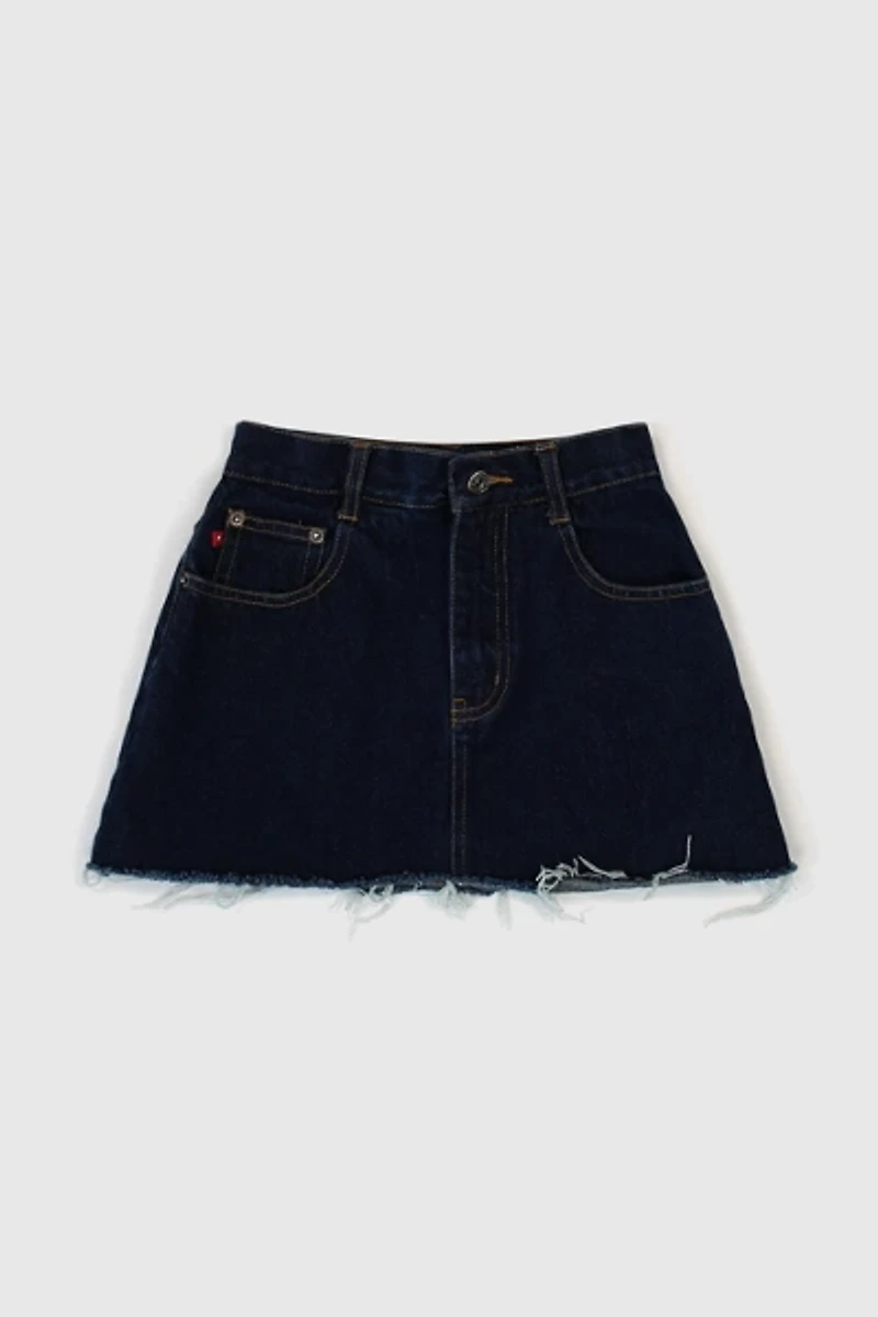 - - Vintage Y2K Distressed Mini Skirt. This dark wash denim skirt is a classic fit. Made from 100% cotton and in great condition 8/10 with some light wear as seen in photos. Tag reads size vintage 12 reg but please compare to measurements below for the best fit!