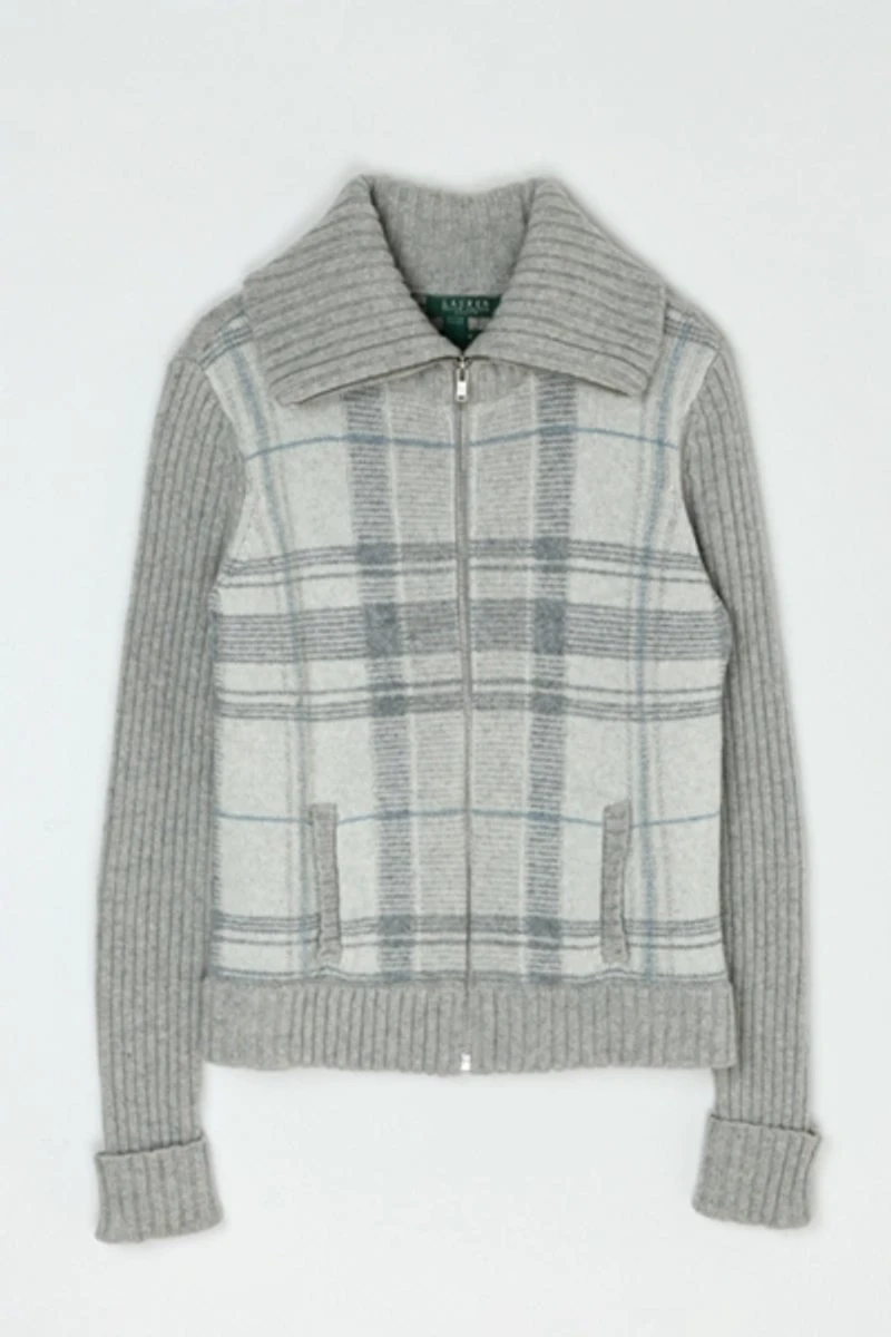 Vintage Y2k Grey Plaid Zip-Up Knit Jacket