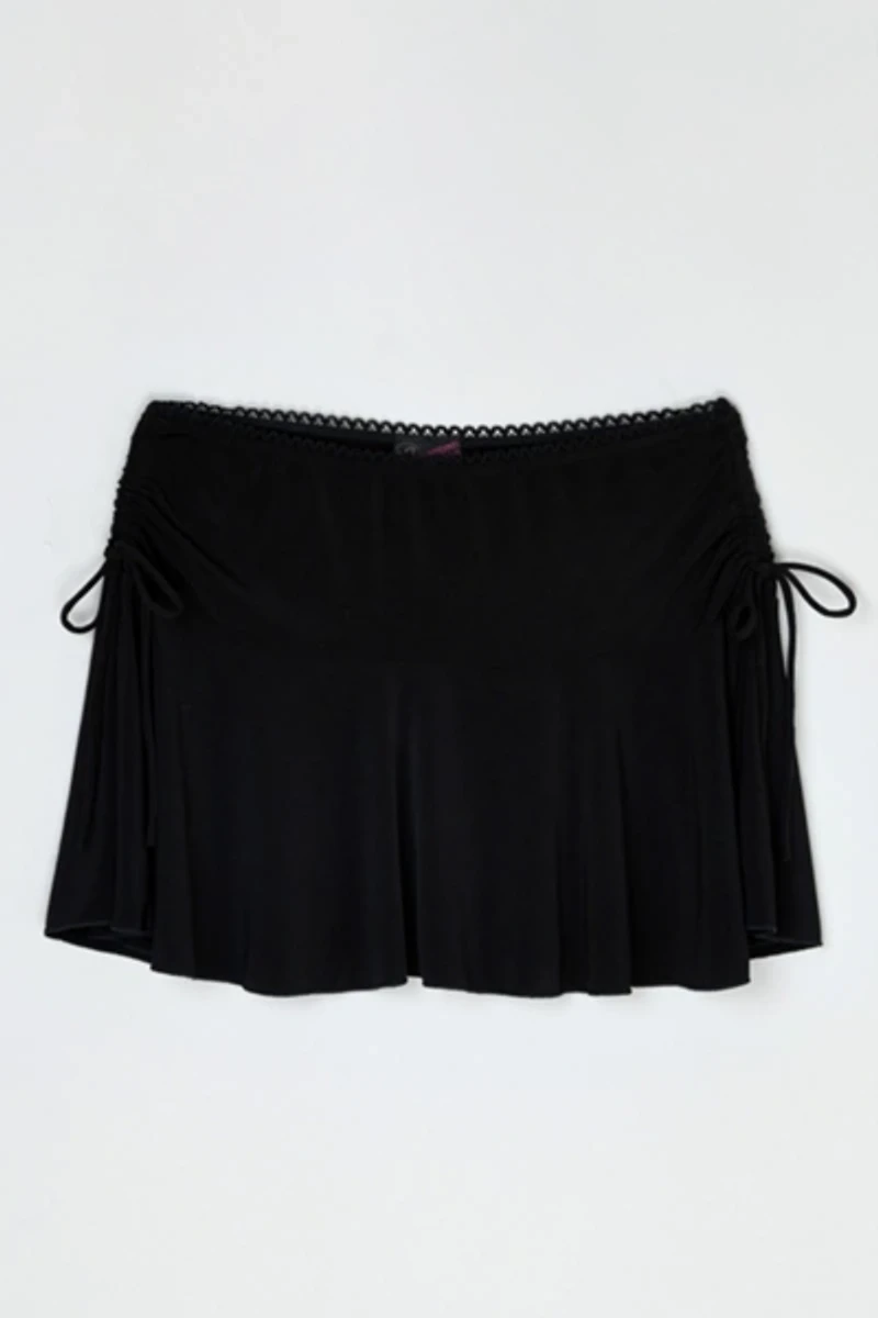 This vintage y2k mini skirt has ruching & ties at the sides, and lace along the upper edge. It's pull-on (no closures). It fits about size S/M - it measures 26-30" around the waist, and 14" long waist-to-hem (there's no size on the tag). This item is in excellent vintage condition.