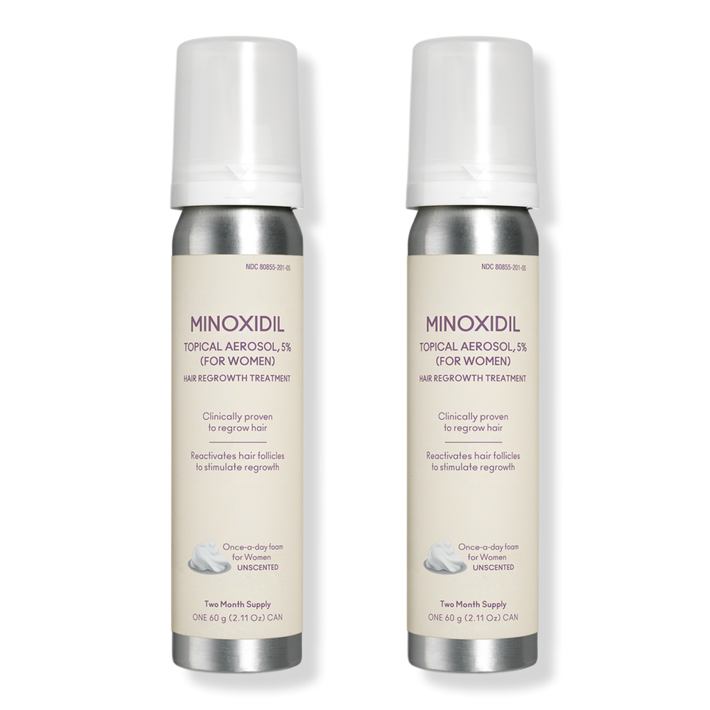 FLOURISH MINOXIDIL 5PRCNT FOAM 2PK 2OZ. Benefits: Reactivates hair follicles. Regrows hair. Stimulates. Features: A lightweight, fast-absorbing foam.. Ideal for:. Women with moderate to severe hair loss due to:. 1. Hereditary factors. 2. Hormonal factors. Stress. Safe for chemically treated or colored hair. Includes: Minoxidil 5% Foam (2 x 2.1 oz).