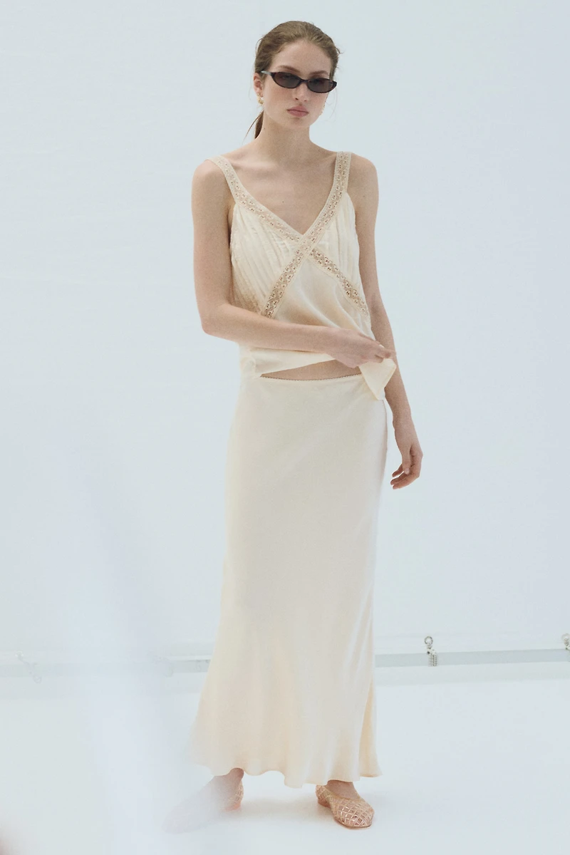 Long, fitted, bias-cut slip skirt in a woven viscose and modal blend with a slight sheen. High waist, picot-trimmed elasticized waistband, and a gently flared hem. Lined.