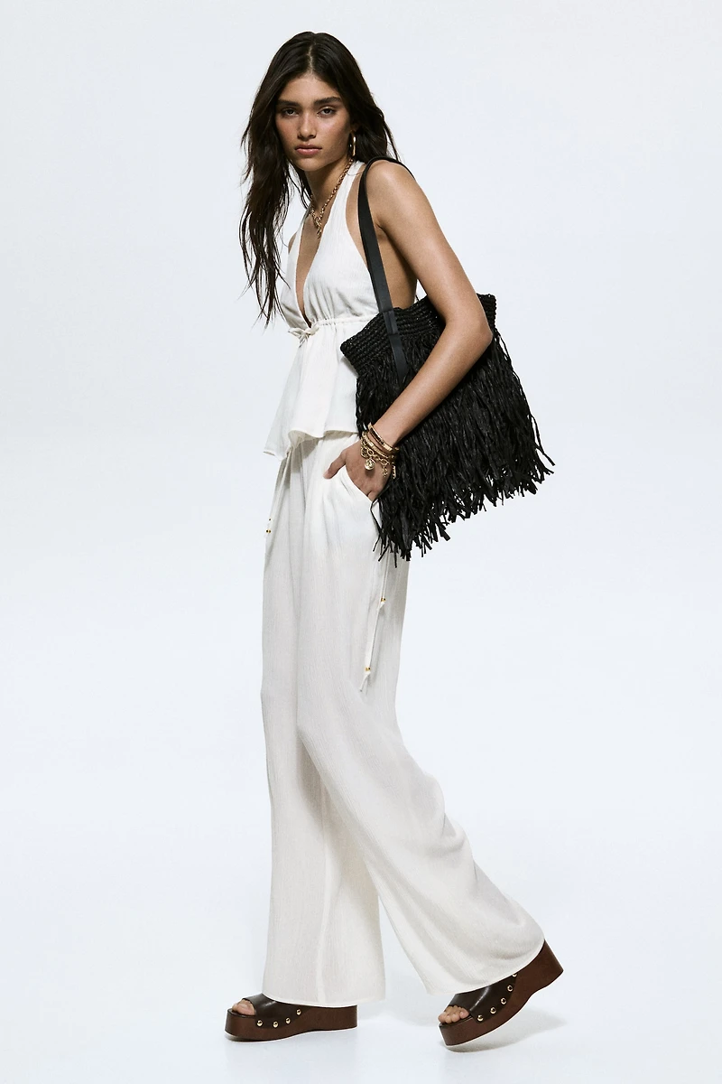 Pants in woven, crinkled viscose fabric. Elasticized, drawstring waistband with bead-embellished ties at sides. Straight legs.