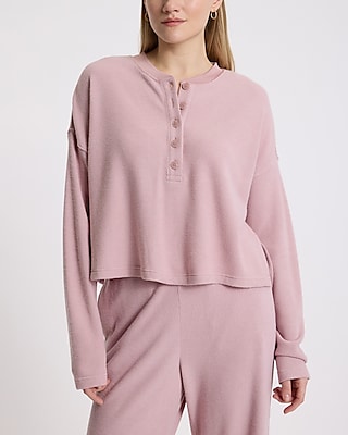 A cozy cropped tee with a waffle fabric, henley neckline, and long sleeves. Pair with matching bottoms for a complete look.