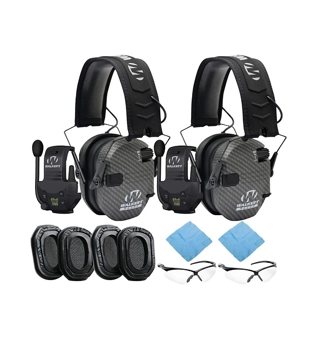 Walkers Razor Slim Electronic Muff (Carbon) Bundle with Walkie-Talkie Attachments Gel Filled Earpad Shooting Glasses and Microfiber Cleaning Cloths (1