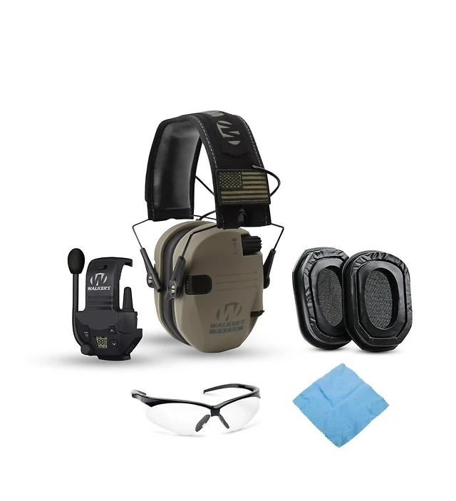 Walkers Razor Slim Electronic Muff (Flat Dark Earth) Bundle with Walkie-Talkie Attachments Gel Filled Earpad Shooting Glasses and Microfiber Cleaning