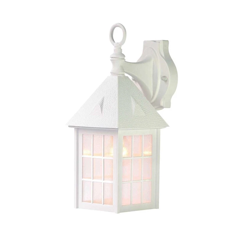 Add some fun to your outdoor decor with this House Shaped Wall Light. The wall bracket has a medallion shape and is attached to a tapered swing arm. The bracket and swing arm are colored to a finish. The arm is attached to the top of the light to a narrow ornament which has a circular hoop on top. The roof has a sloping design with closed window details. Extending from the roof there is a window frame with thicker corner pieces and thinner square details. The frame is in a finish which looks great against the clear textured glass inside. This light will look great on its own or as a pair around your front door.